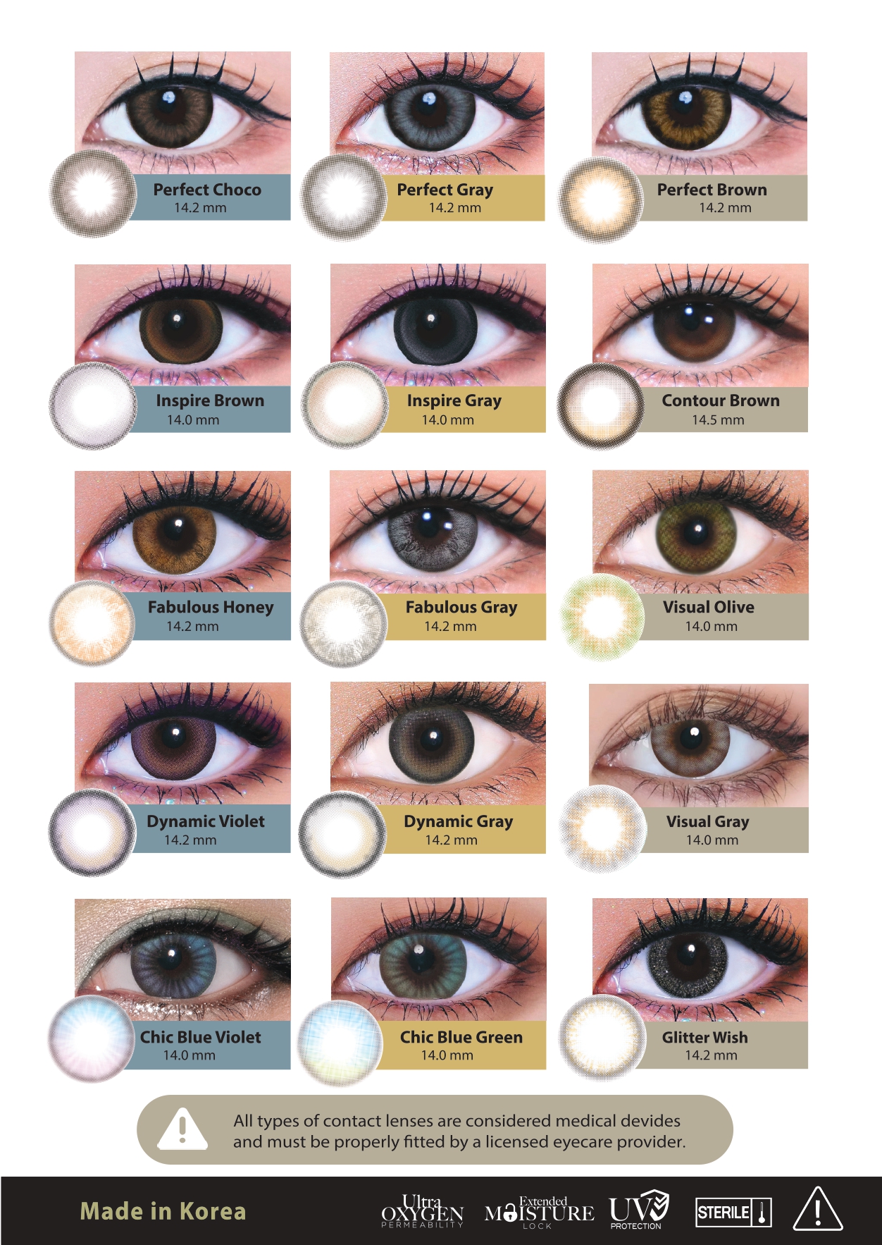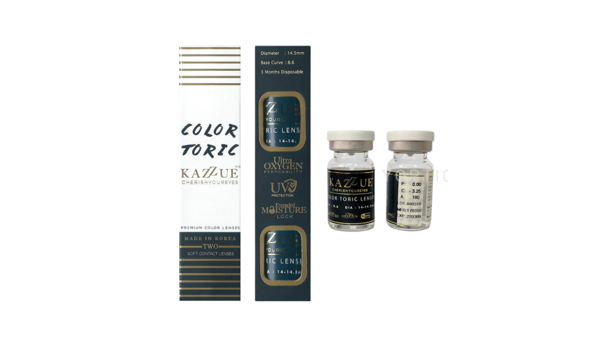 Kazzue Color Toric, made in Korea, offers 5 unique shades—Classic Brown, Classic Grey, Classic Black, Concept Brown, and Concept Grey. Featuring Sandwich Technology, it ensures the color pigments never touch your eyes for added safety. With high UVA and UVB protection, a 45% water content, and suitability for up to 12 hours of extended wear, this lens provides both comfort and eye protection throughout the day.