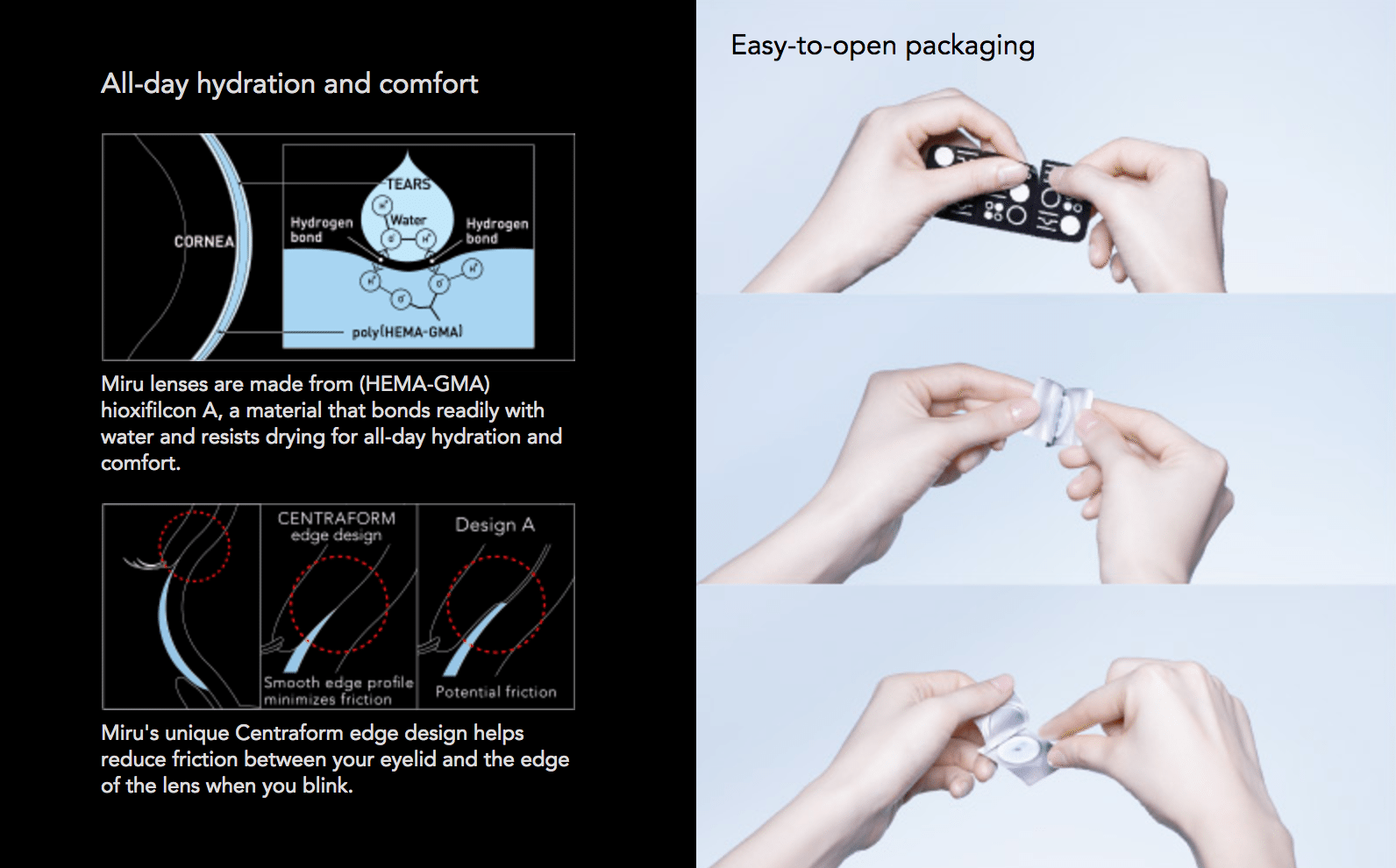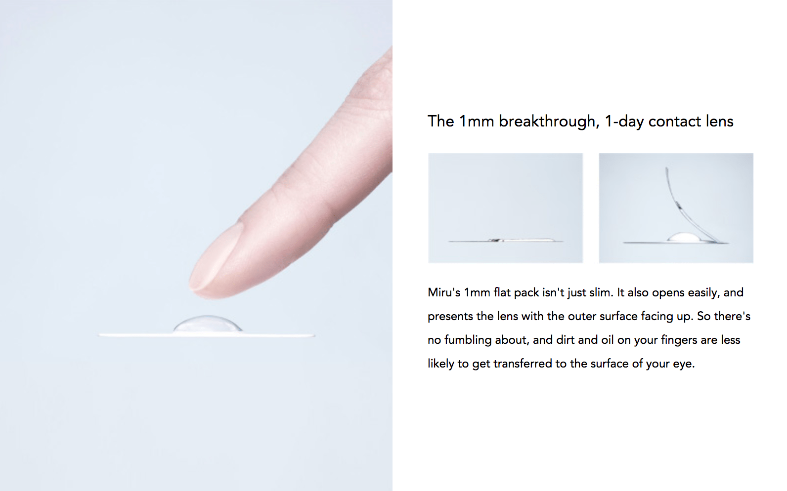 Miru 1 Day Menicon Flat Pack is a daily disposable lens known for its ultra-slim Flat Pack design, making it one of the most hygienic and travel-friendly options available. Packed in a 1mm thin blister, it minimizes finger contact with the inner lens surface, helping to reduce the risk of contamination. Made from Hioxifilcon A, it retains moisture effectively, providing long-lasting hydration and comfort throughout the day. Ideal for those with an active lifestyle, Miru Daily also includes UV protection to help shield your eyes from harmful rays, while offering crisp, clear vision in a clean, convenient format.